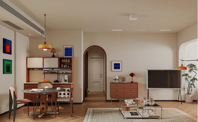 以暖白色啞光柜體、胡桃木色臺面/家具、人字拼木地板為主,搭配大理石紋理裝飾件,呈現自然溫潤的質感;線性燈光(營造柔和氛圍)、懸浮式柜體(弱化厚重感)、透明餐椅(減輕視覺負擔)等元素,強化了“輕簡”的現代感;既滿足現代家庭的“互動式生活”需求(客餐廚聯動),又通過家政區的獨立設置提升實用性,是“美學與功能平衡”的當代居住空間設計案例。