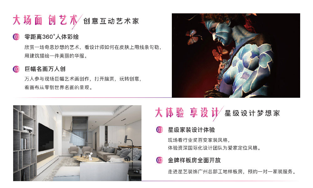2018年1月6日在廣州白云區五號停機坪購物廣場舉行盛大落地活動,到場客戶可欣賞人體彩繪,參與巨幅名畫創作,好禮與樂趣并行?;顒蝇F場不止有豐富互動,到場咨詢客戶還可獲得精美禮品一份?;顒蝇F場資深設計師云集,一對一專業咨詢,體驗優質的家裝服務。
