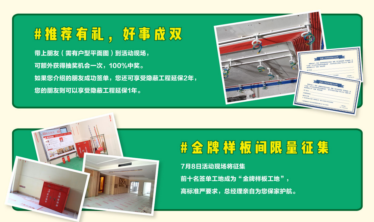 與好伙伴同享好禮,就是節日的意義。那么,這次驚喜大禮怎能不告訴你身邊的小伙伴呢。推薦好友成功簽單,豪禮翻倍。7月8日活動現場推薦好友成功簽單,您 即可享受隱蔽工程延保2年,您的朋友 也能享受隱蔽工程延保1年。好品質,值得分享。