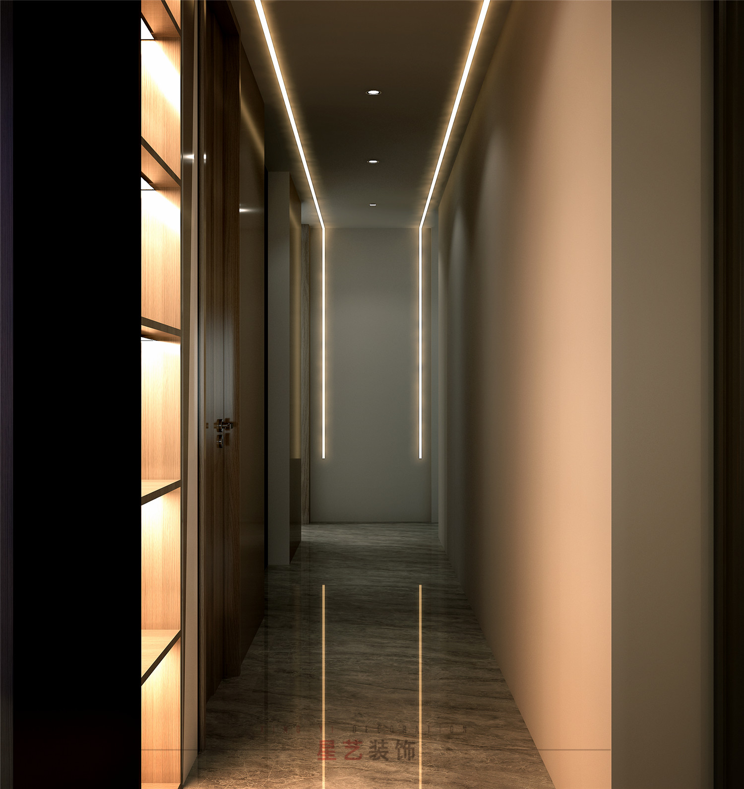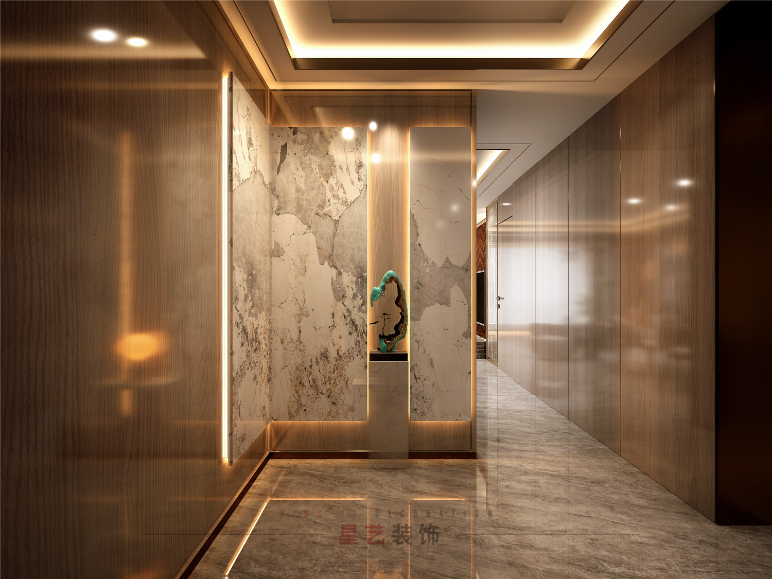 進來玄關,滿眼都是余暉落日中的浩瀚星空。輕奢細致的軟裝布置與現代材質組合,尤其是靈活的線燈布置,上一秒沉溺于晚霞的浪漫,下一秒便回歸科技生活,使“自然”與“奢華”這兩種不同的氣質得以共生。