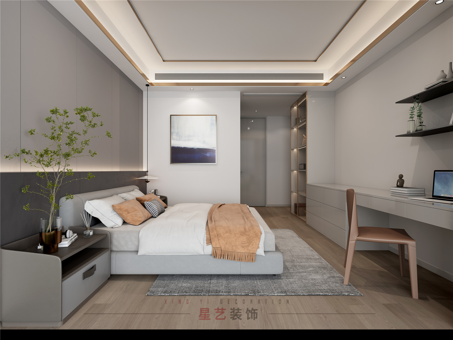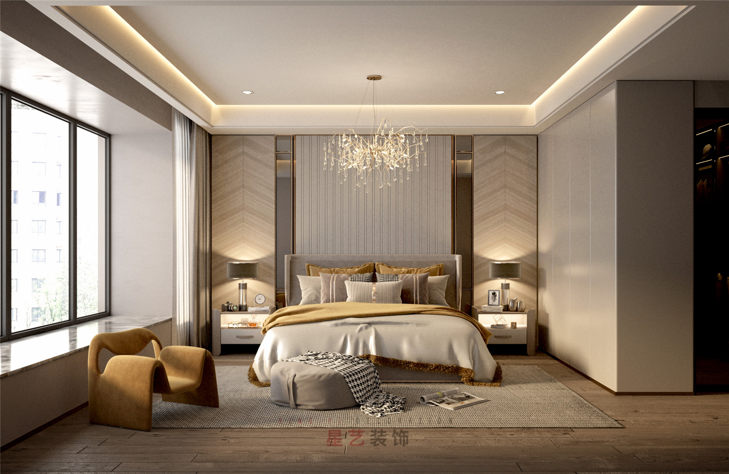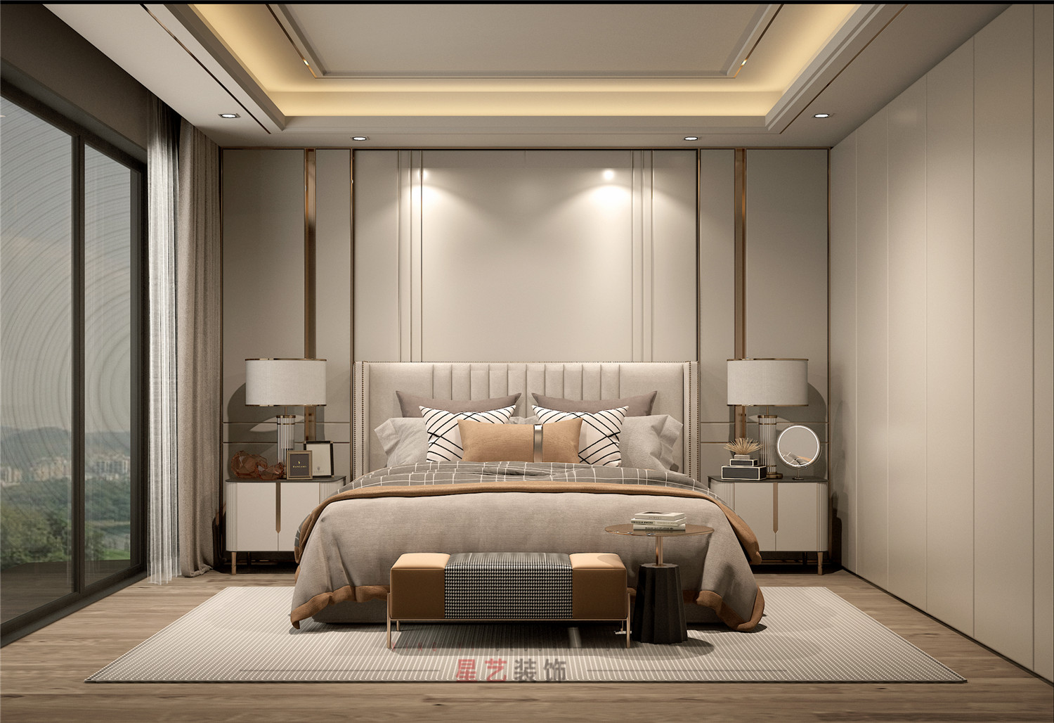 主人房與長輩房風格比較相似,對稱式的空間分割方式表現出細膩的質感層次,布局上疏密有度,簡繁相適。