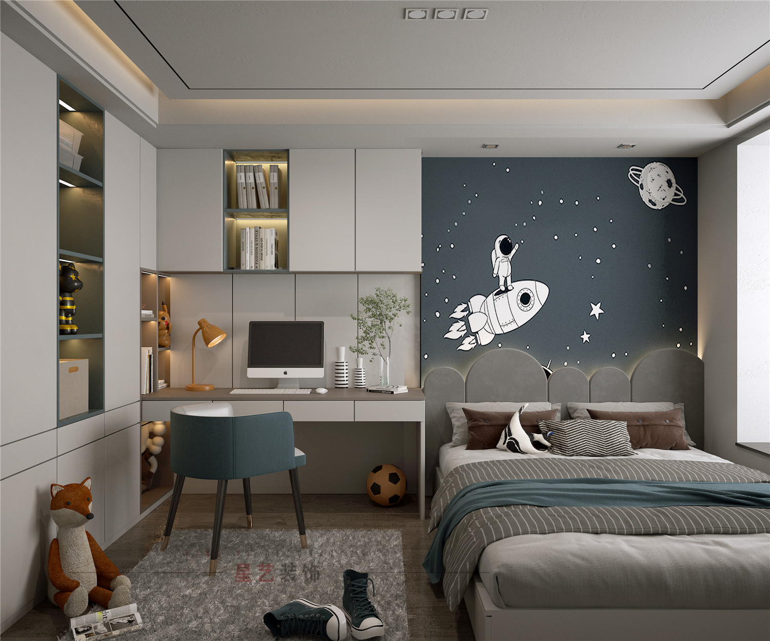 當孩子降生到這個世上,天上就會亮起一盞燈,所以有了星星。平常給孩子多一些想象,保持天真,這也是一種超能力。小孩房添上一抹藍綠色,那是青春邁向成長的顏色。