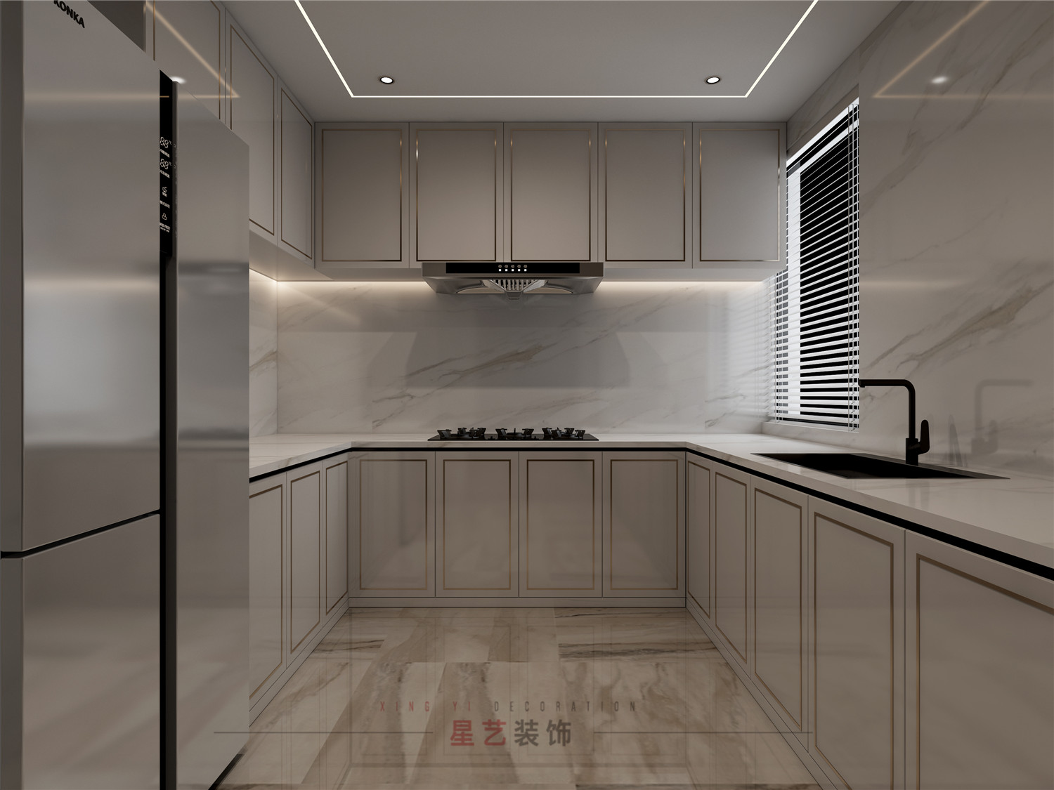 廚房以經典的黑白組合搭配金屬邊框點綴,大理石墻面與地面相呼應,設計感、線條感、質感,都到達一個適度的狀態。