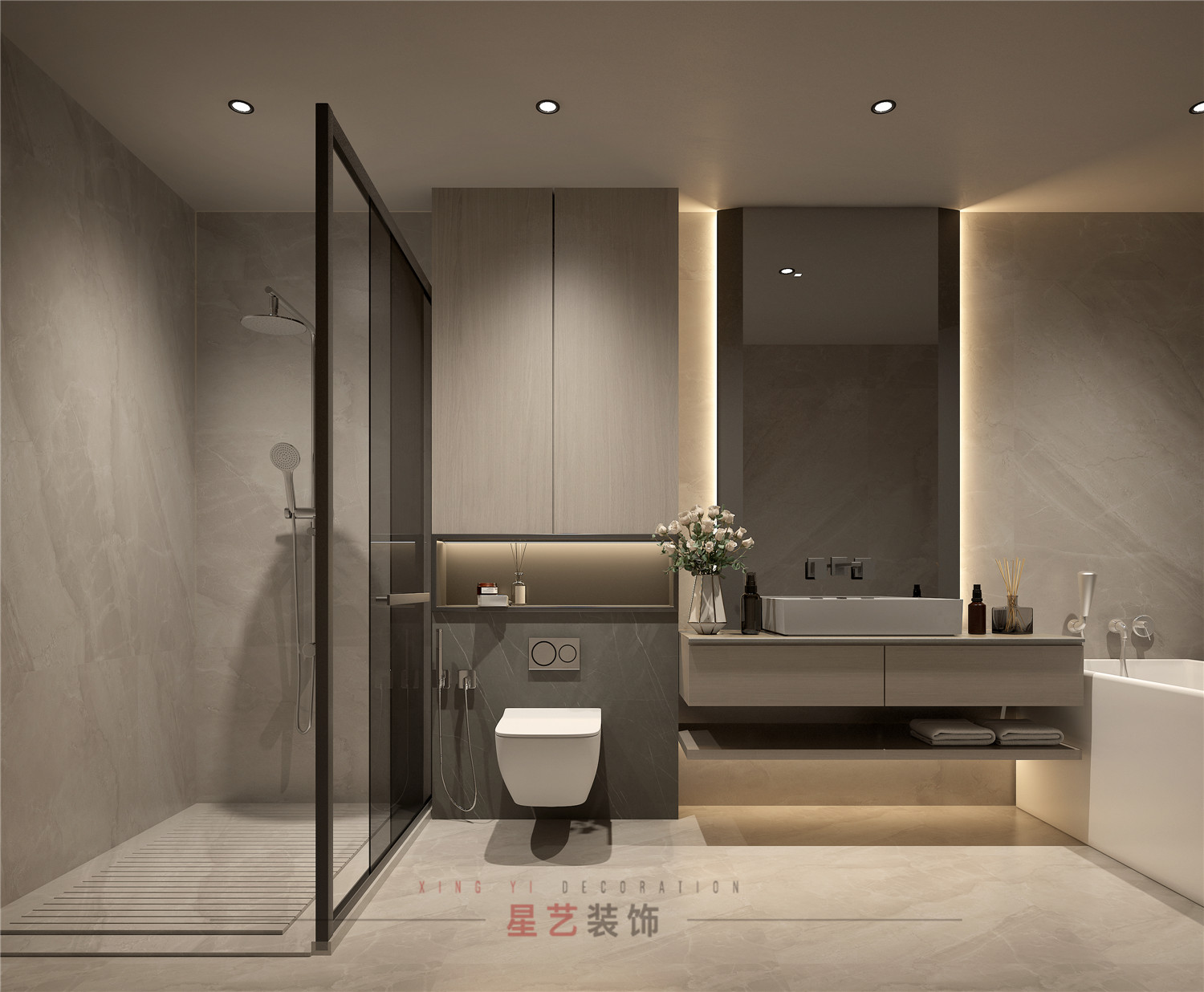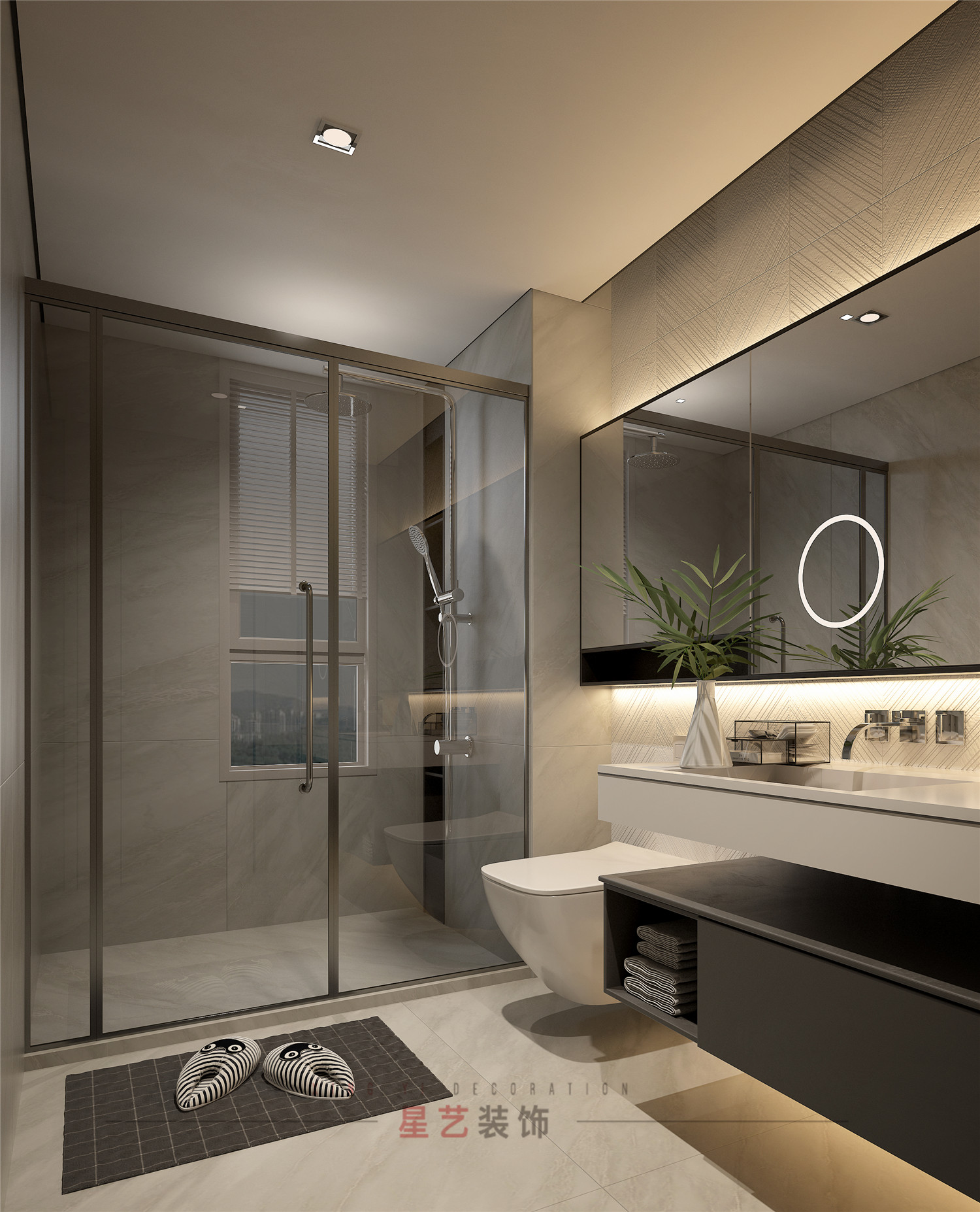 極簡線條的浴室柜更加流暢自然,筒燈與燈帶設計相結合,燈光效果別具一格。壁掛馬桶,顏值在線而且無衛生死角,磨砂感瓷磚,壁掛浴室柜,每一件物品都是精挑細選,搭配起來氣質和諧。