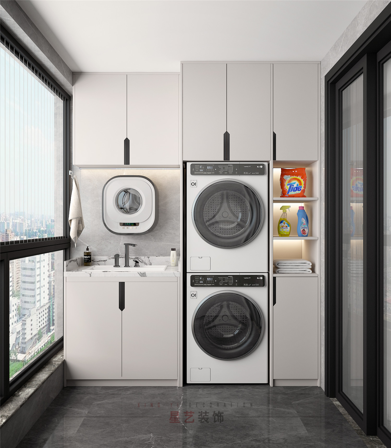 陽臺上布置洗衣機,洗手池與置物柜,將空間的時尚奢華提升到一個新的水平。