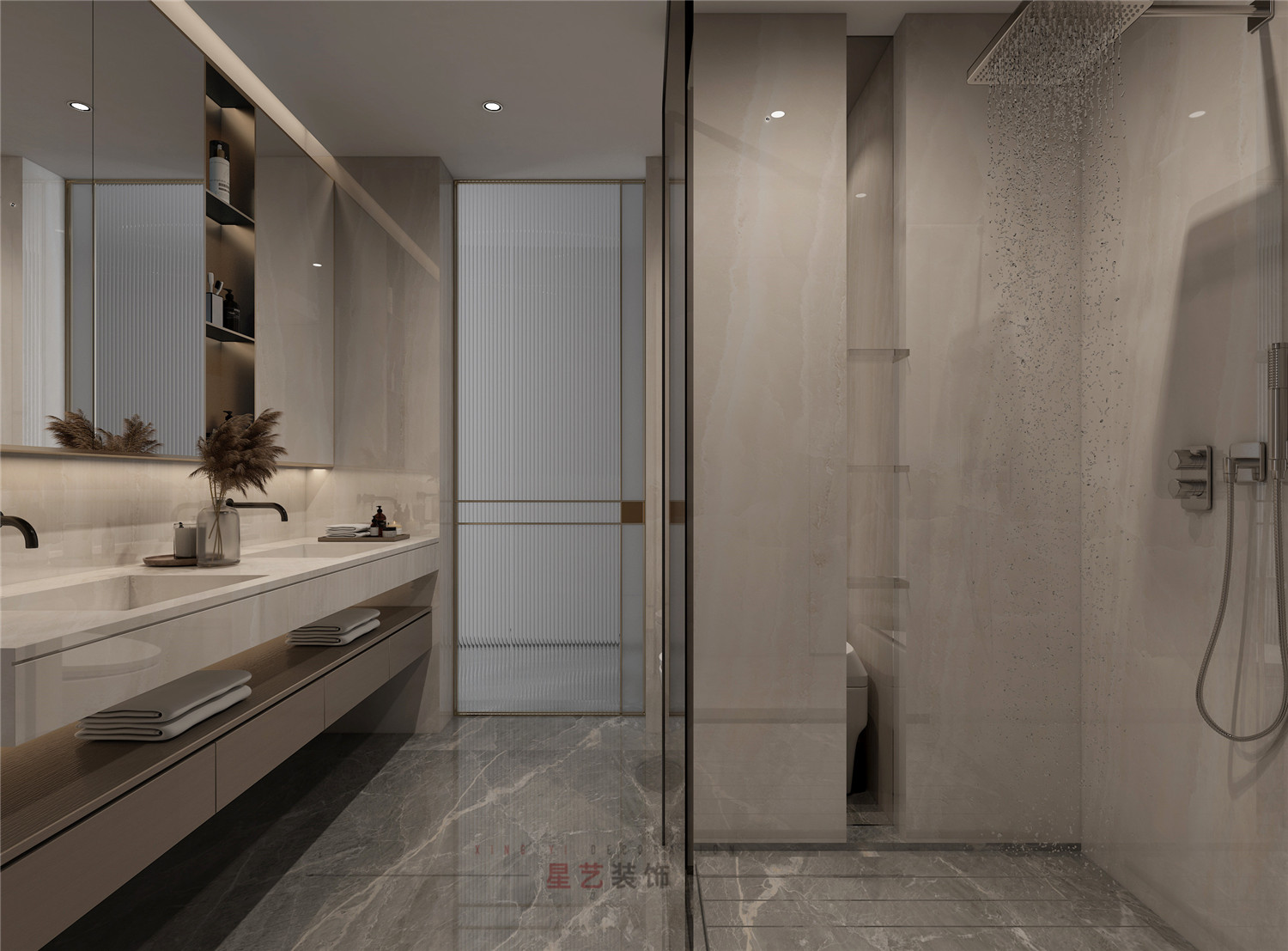 進衛生間,水池下方的壁龕設計可以放置換洗衣物或日常洗浴用品,整潔自然