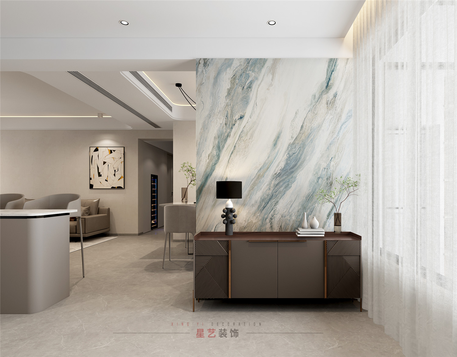 進(jìn)入玄關(guān),海潮般的大理石紋理映入眼簾, 結(jié)合深咖色亞克力櫥柜,一動(dòng)一靜恰到好處,日光透過(guò)紗簾傾瀉而下,將世界囿于地面,靈動(dòng)舒揚(yáng),捎來(lái)生活的囈語(yǔ)。
