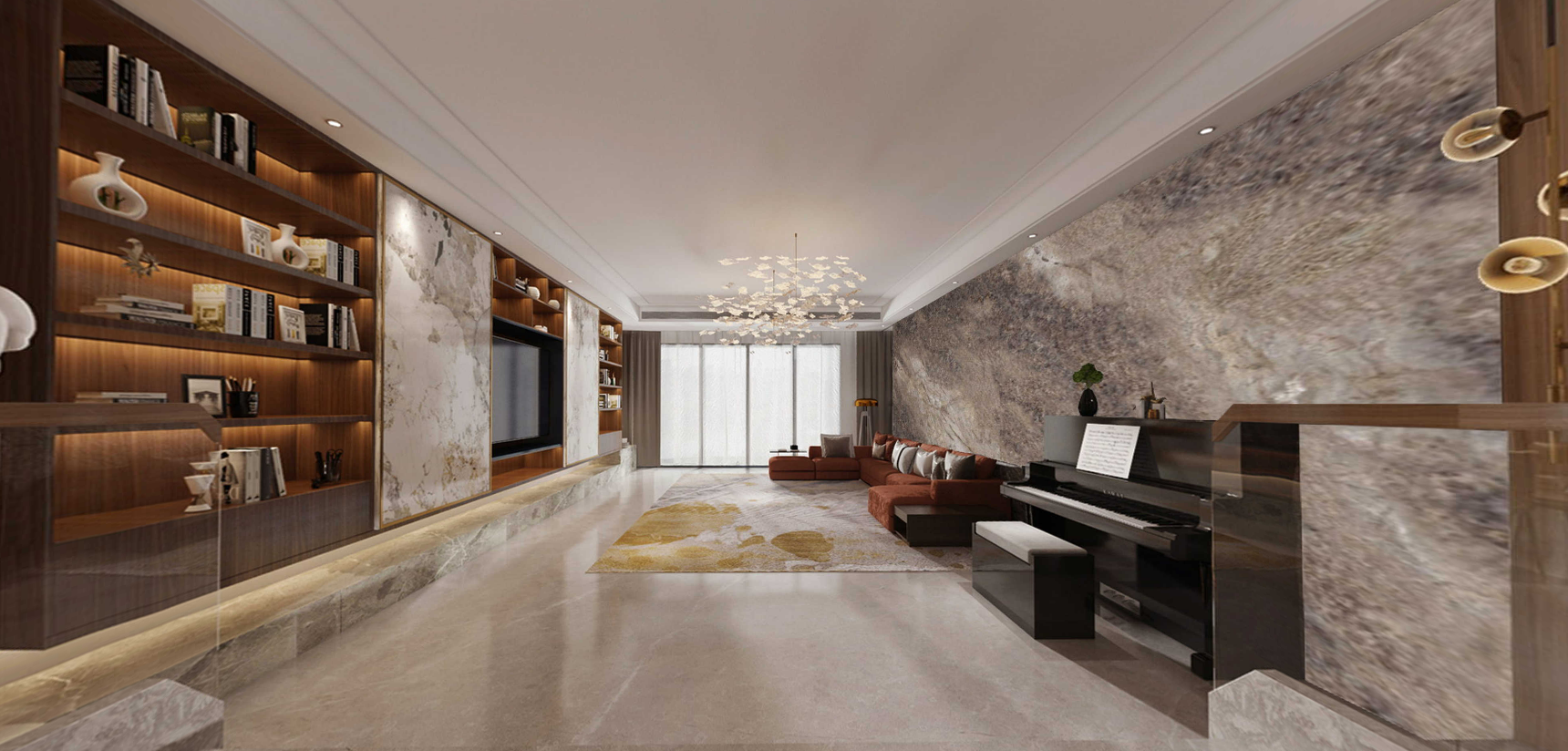 全屋以原木風(fēng)為主,胡桃木色的墻板搭配奢石巖板,同色系的組合式廳柜+L型沙發(fā),將生活場景娓娓道來。
