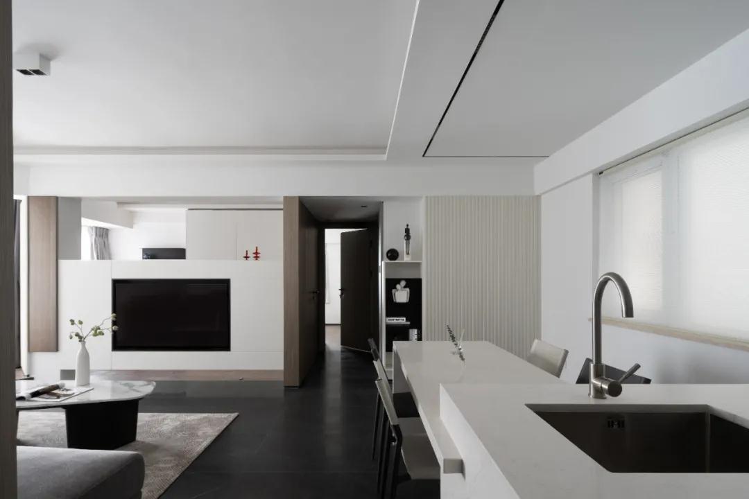 客廳、餐廳、廚房在同一個空間,連成一體。廚房改為開放式的布局,闊然了整個布局,又因客廳的陽臺是朝西方向,且樓層高,沒有建筑物遮擋,讓自然光線灑滿整個屋子,直接引入廚房內(nèi)。