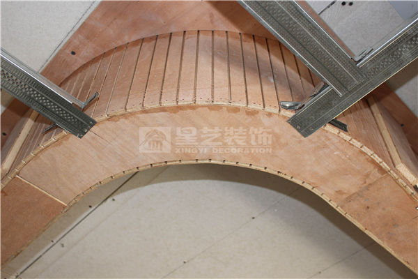 A、弧形或異形天花,用九厘板背面開鋸路襯底,面罩3厘板。目的:造型順暢。