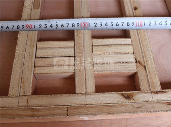 將15厘板條涂好白乳膠粘貼在飾面板上形成框架,再在上面粘貼一層飾面板。